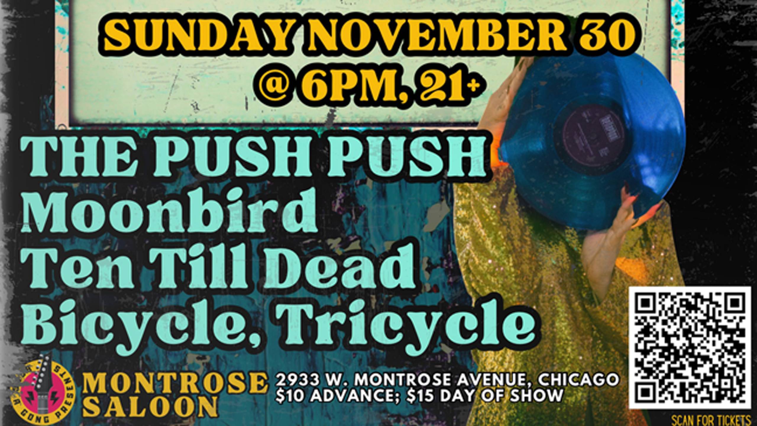 $10 advance, $15 day of show; 21+ w/ID Bands Performing: 6pm THE PUSH PUSH (instagram.com/thepushpush) 7pm Moonbird (instagram.com/moonbirdband) 8pm Ten Till Dead (instagram.com/tentilldead) 9pm Bicycle, Tricycle (https://bicycletricycle.org) ADVANCE TICKETS: https://www.eventim.us/event/THE-PUSH-PUSHMoonbirdTen-Till-DeadBicycle-Tricycle/668605