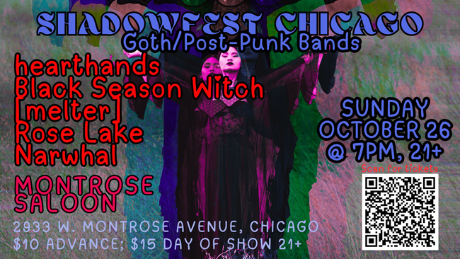 $10 advance, $15 day of show; 21+ w/ID Bands Performing: 7pm Black Season Witch (instagram.com/blackseasonwitch) 8pm (instagram.com/meltermusic) 9pm Rose Lake (instagram.com/roselakemusic) 10pm Narwhal (instagram.com/musicbynarwhal) ADVANCE TICKETS: https://www.seetickets.us/event/SHADOWFEST-CHICAGO-Montrose-Saloon-Sunday-October-26/654323