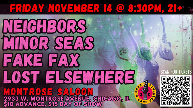 $10 advance, $15 day of show; 21+ w/ID Bands Performing: 8:30pm Neighbors (instagram.com/neighborsrock) 9:30pm Minor Seas (instagram.com/minorseas) 10:30pm Fake Fax (instagram.com/fakefax_) 11:30pm Lost Elsewhere (instagram.com/lostelsewhere) ADVANCE TICKETS: https://www.eventim.us/event/Montrose-Saloon-Friday-November-14/661822