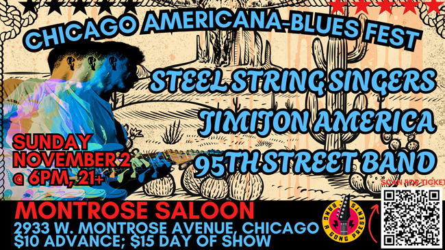 Montrose Saloon 2933 W Montrose Ave, Chicago, IL, United States$10 advance, $15 day of show; 21+ w/ID Bands Performing: 6pm Steel String Singers (instagram.com/steelstringsingers) 7pm Jimijon America (instagram.com/JimijonAmerica) 8-10pm 95th Street Band (facebook.com/95thstreetband) ADVANCE TICKETS: https://www.eventim.us/event/CHICAGO-AMERICANA-BLUES-FEST-Montrose-Saloon/665153